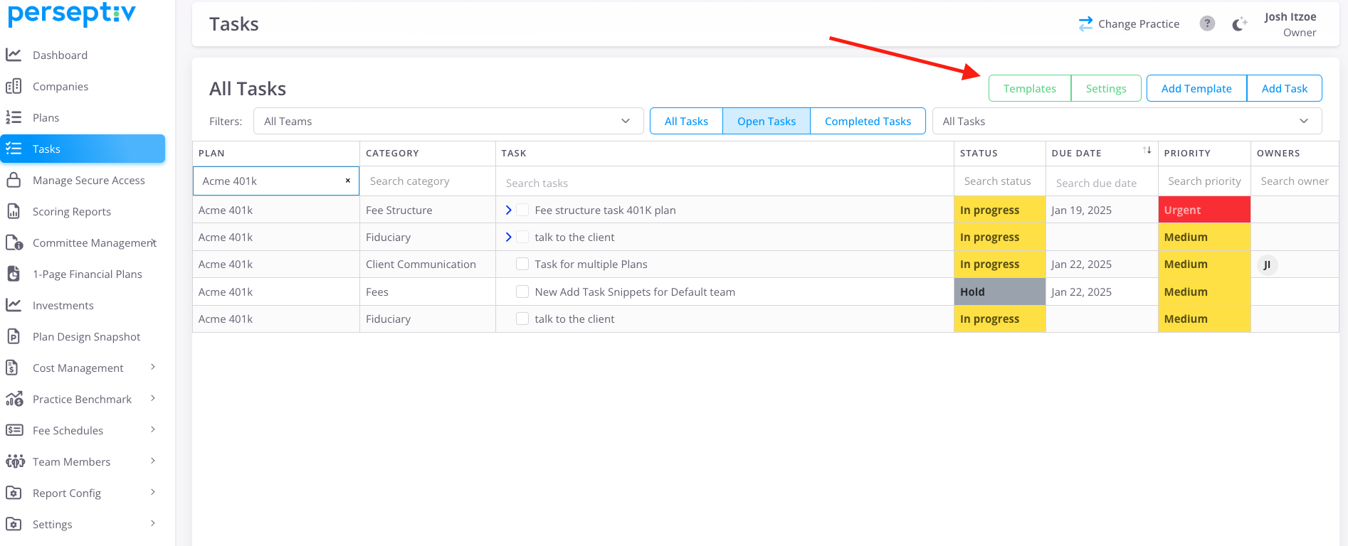 In addition to single/individual tasks, you can create and manage task "templates".  Task templates are used to manage multi-step tasks. You can nest tasks under a main task. These can be added by selecting "template" next to "settings".
