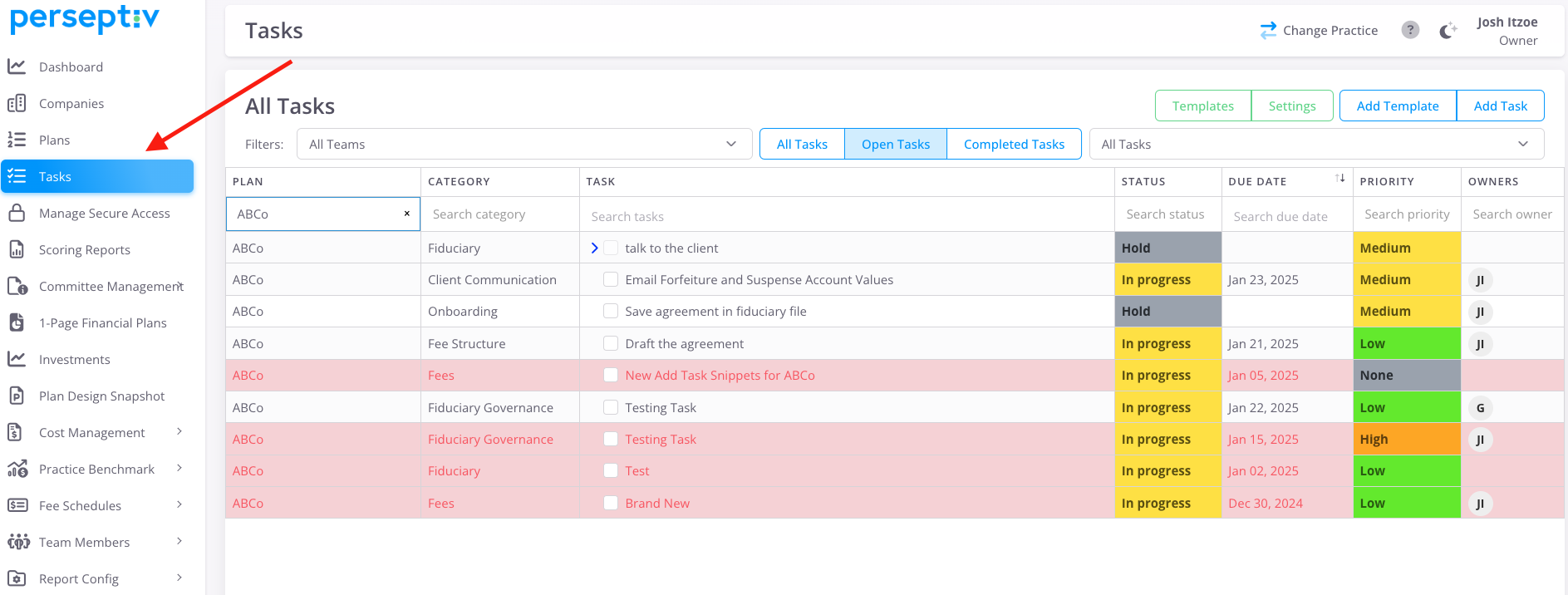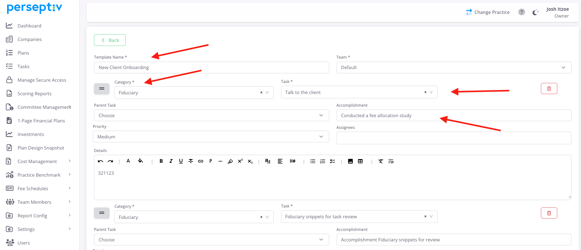 To create a new template, you give it a name (e.g. New Client Onboarding) and then add individual tasks to it.  For each task, select the category, task (this can be custom or selected from the existing options in the category), any accomplishment text, priority and assignee(s).  You can also add addition notes/details to provide context. You can create unlimited tasks or "nest" tasks underneath one another.  To nest them, make sure the "Parent" task is assigned.