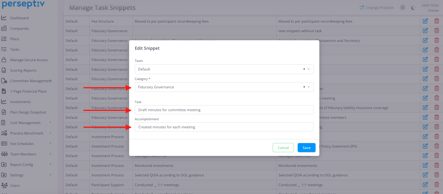 When you click "Add Snippet", a dialog box will appear and you can select the Category the content will be classified under, enter a Task description, and enter an Accomplishment description.  Once saved, these tasks will be available in the system to be applied to a plan and once completed, the accomplishments text will be automatically added to the Accomplishments section and report.