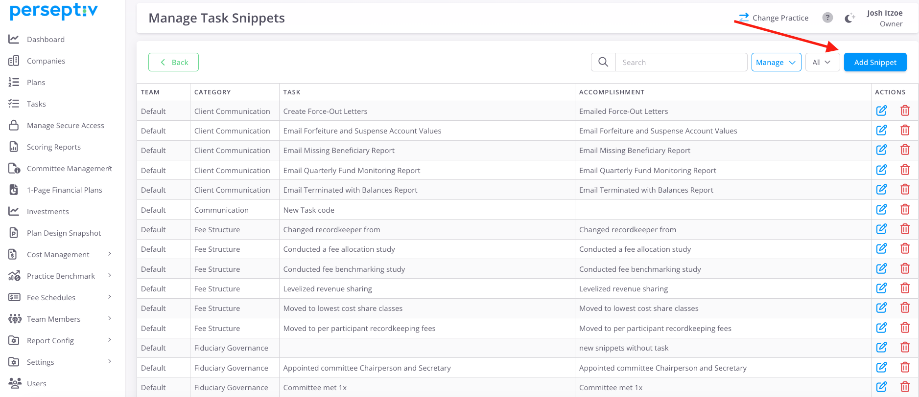 Task and Accomplishment snippets allow you to create repeatable content that can be used throughout the system.  Perseptiv provides default content to get you started.  You can customize any of the existing content by clicking the pencil (