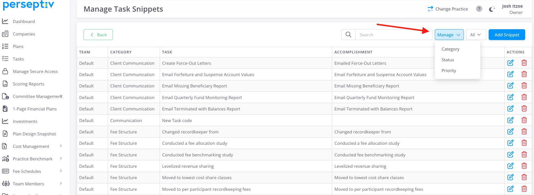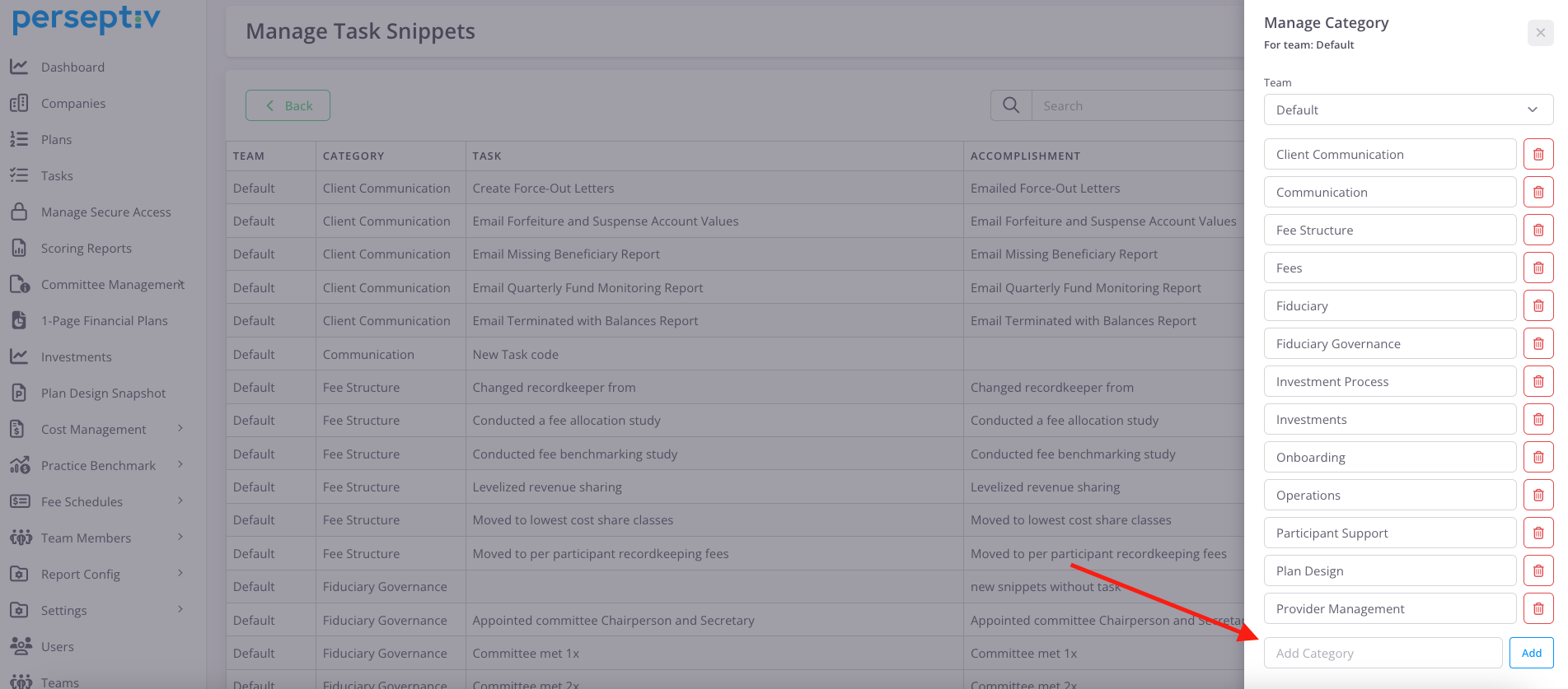 When you select any dropdown, the right panel will open and you can add, delete or customize any option.  Categories are integrated in multiple areas of Perseptiv like Tasks, Meeting Minutes and Accomplishments.