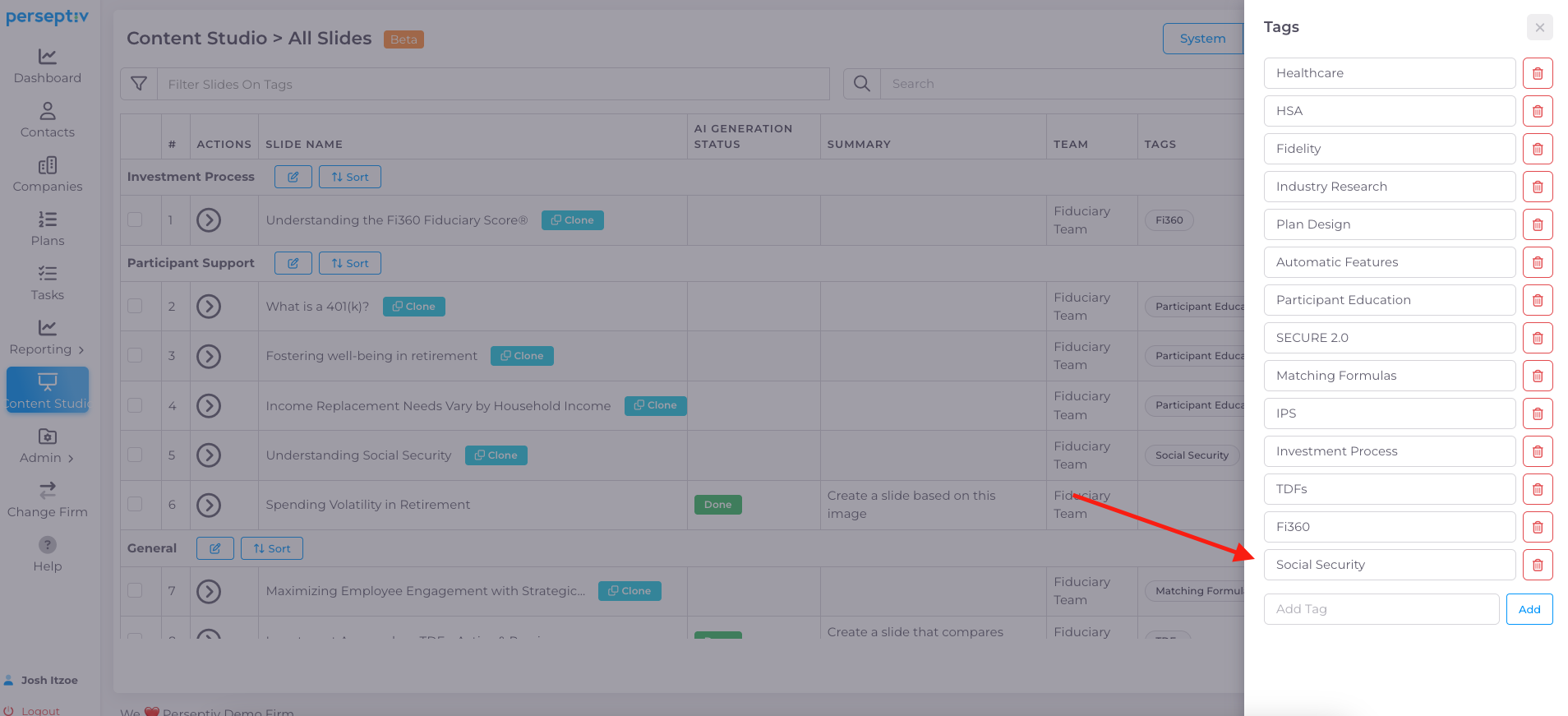 - You can also add a tag in the 'Manage Tags' dropdown and it will be searchable and available when creating slides and presentations