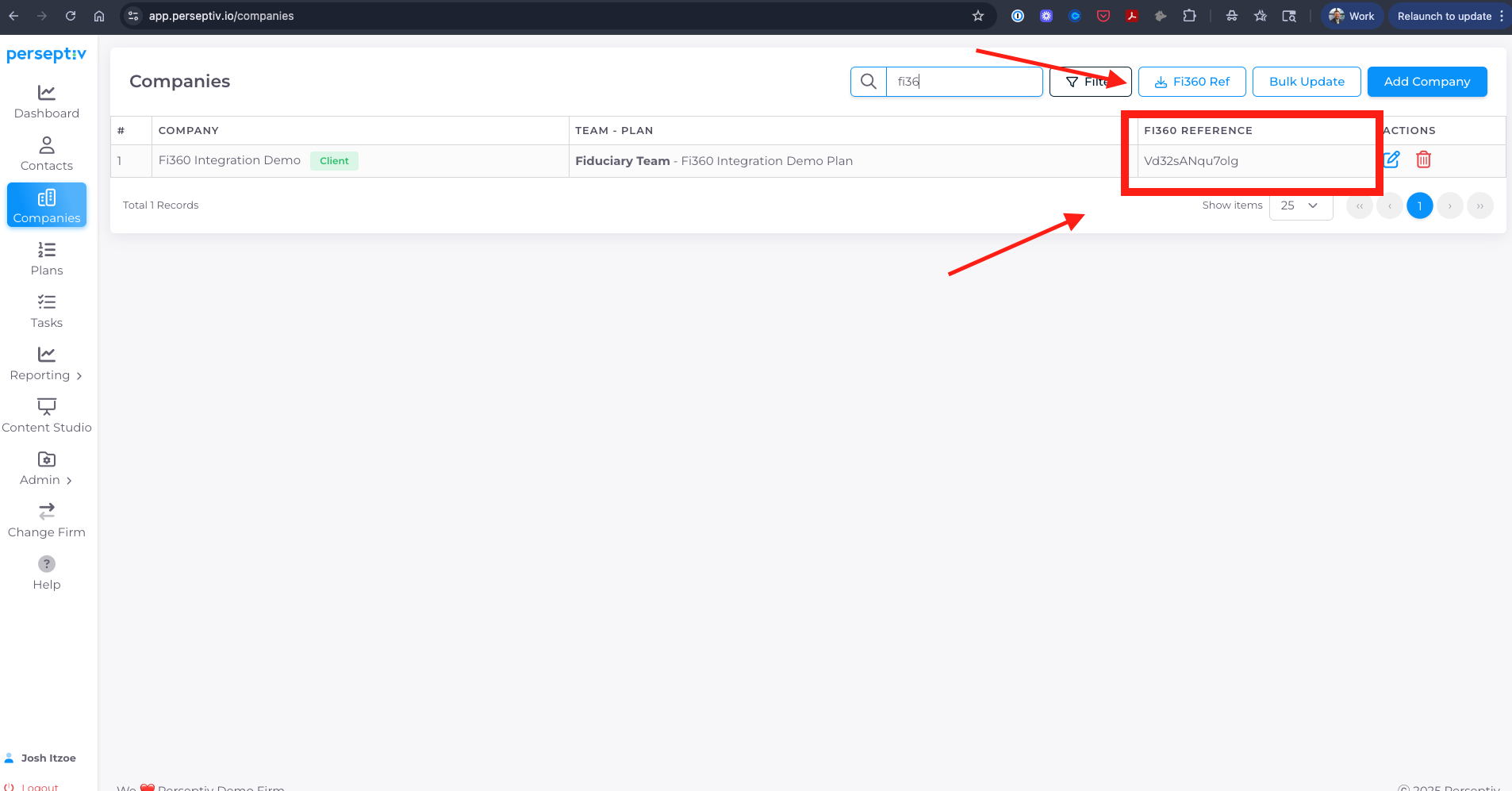 1. Within Perseptiv, navigate to the Companies tab and copy the "FI360 REFERENCE" field for each plan. These reference numbers are system generated and cannot be edited. You can also retrieve this information in bulk download by using the CSV download.