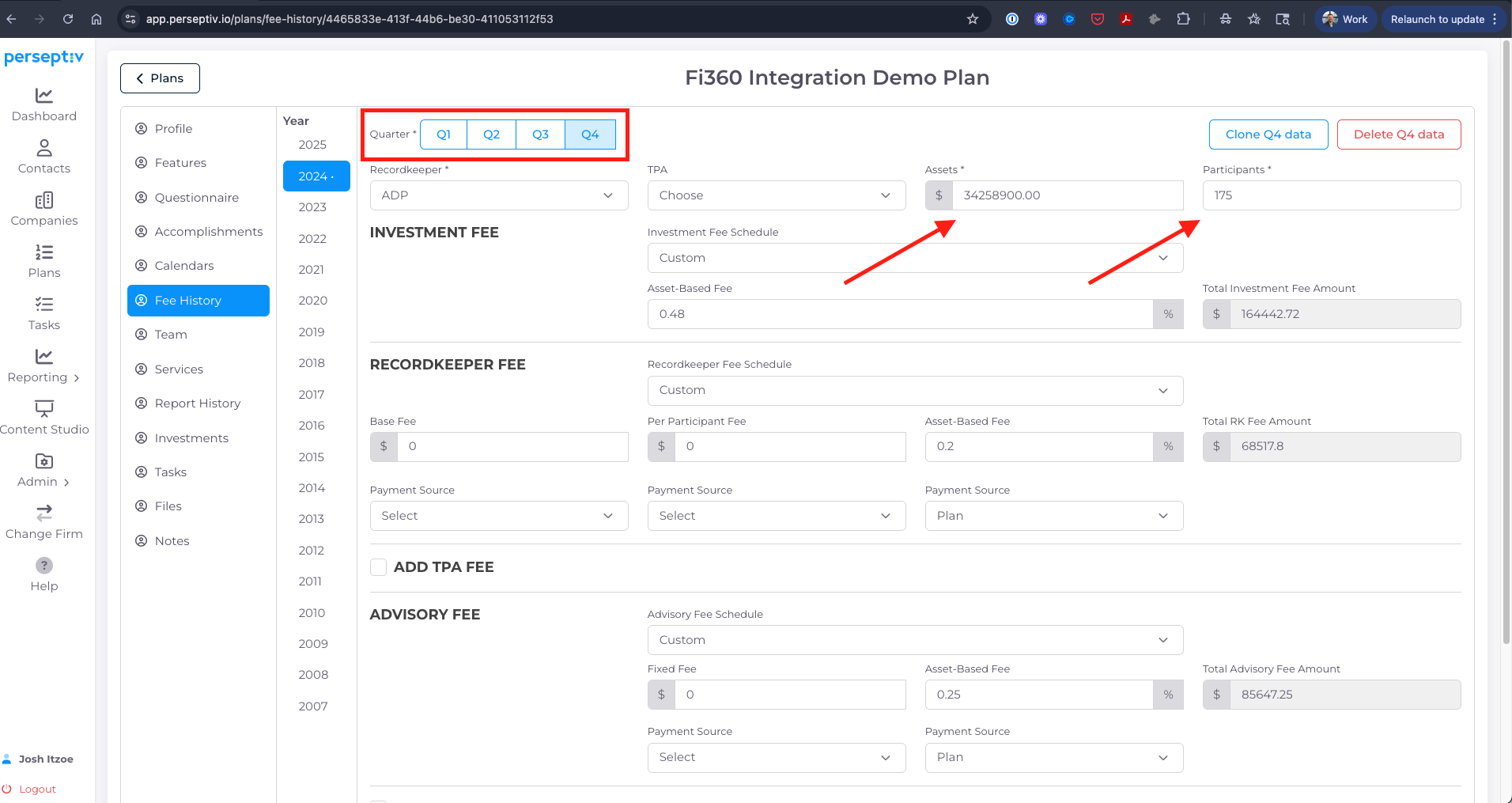 5. In addition, Perseptiv will automatically update your fee history with assets and participants and we now track these values on a quarterly basis instead an annual basis as previously done. These automatic updates streamline the need for manual updating assets and participants and immediately update any Cost Management reports (Plan Fee Benchmark, Historical Cost Trend, etc.).